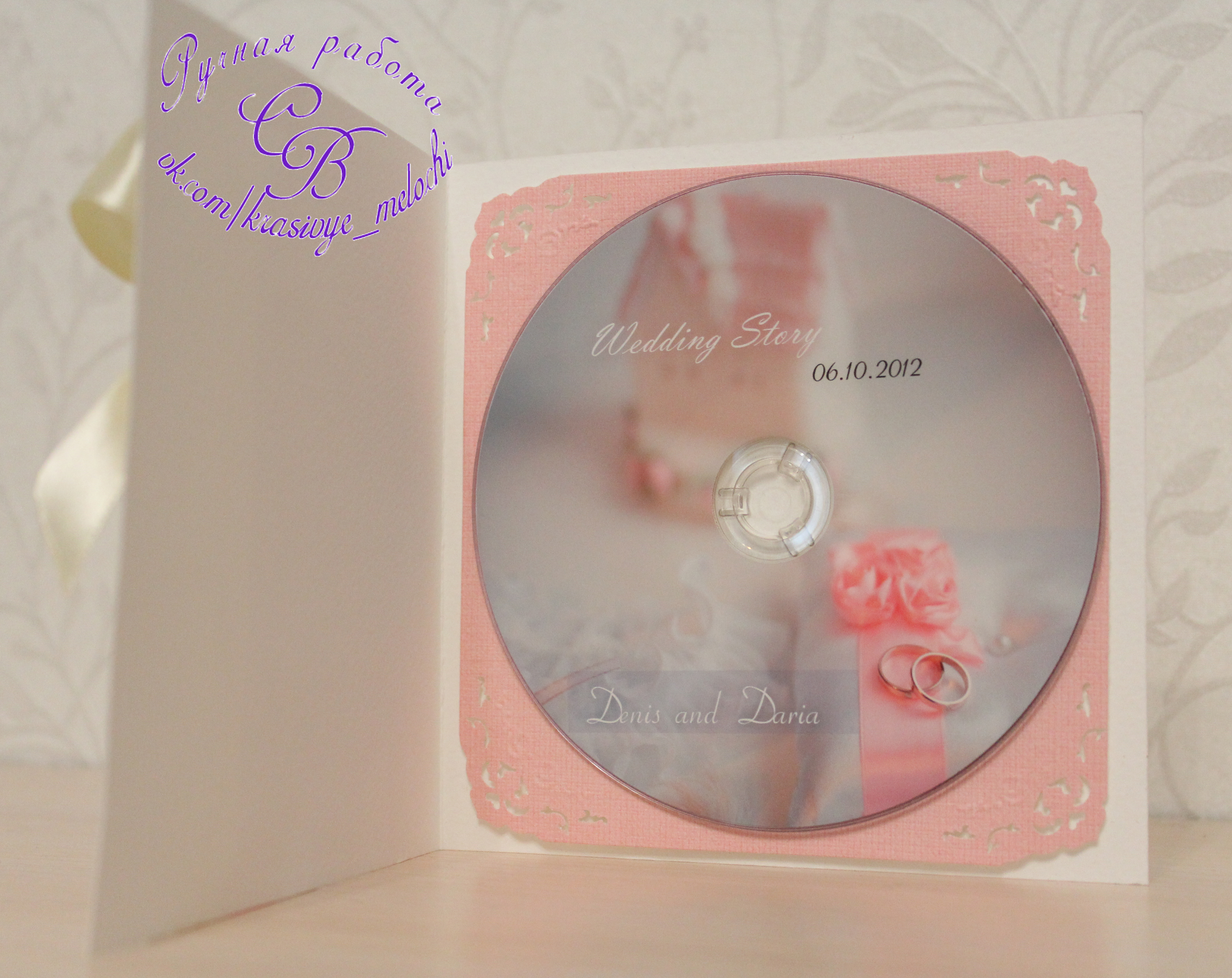 Открытка-конверт для диска со свадебными фотографиями. Открытка выполнена в розовых тонах, в цвет свадьбы, и дизайн открытки схож с приглашениями на свадьбу.