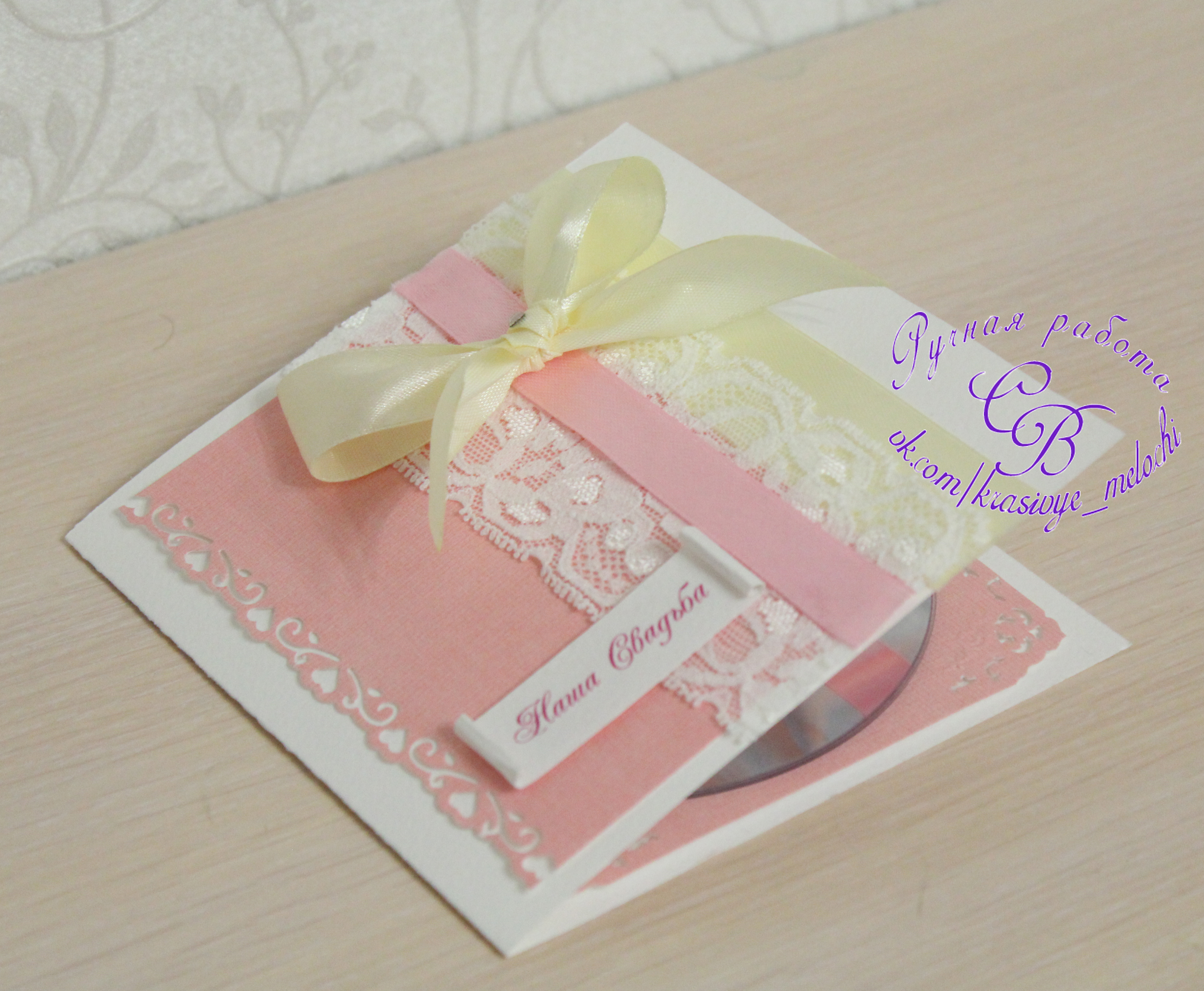 Открытка-конверт для диска со свадебными фотографиями. Открытка выполнена в розовых тонах, в цвет свадьбы, и дизайн открытки схож с приглашениями на свадьбу.