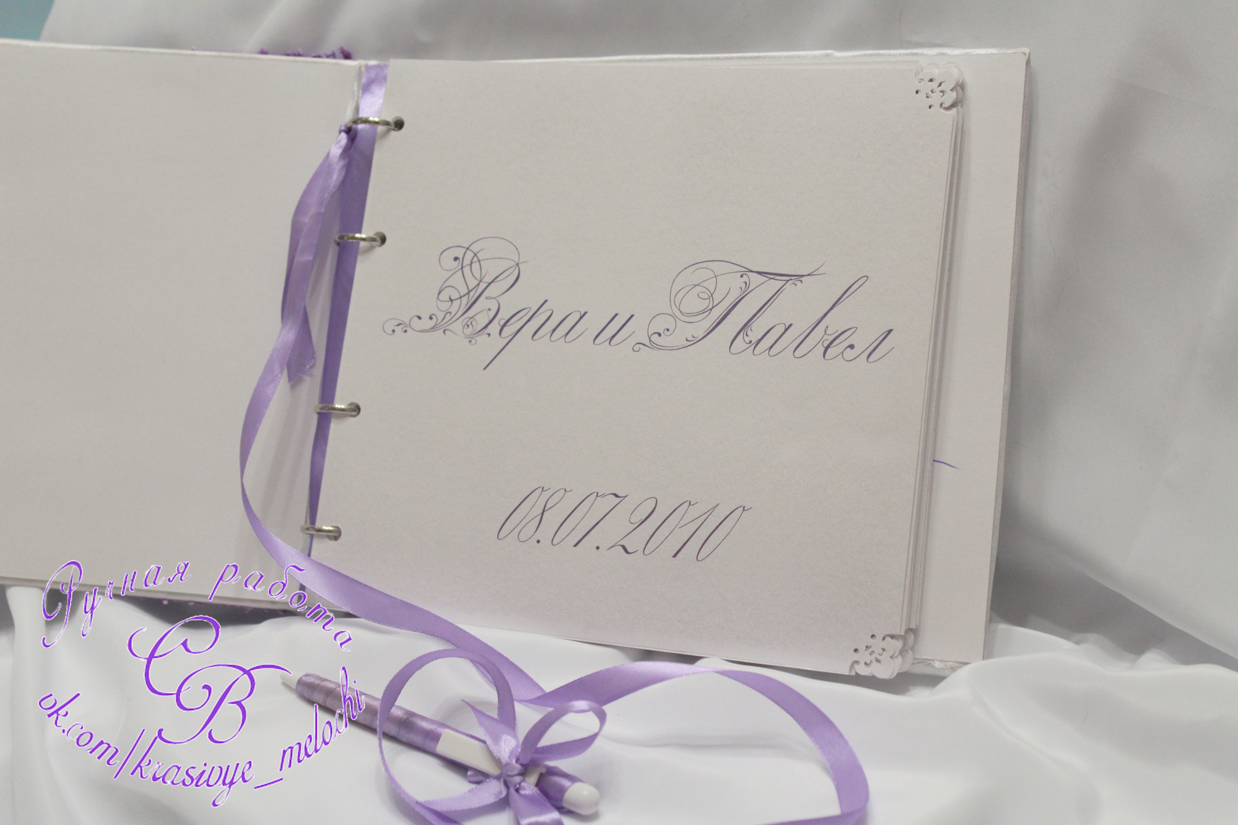 Белый атлас, белый перламутровый картон и сиреневое кружево!