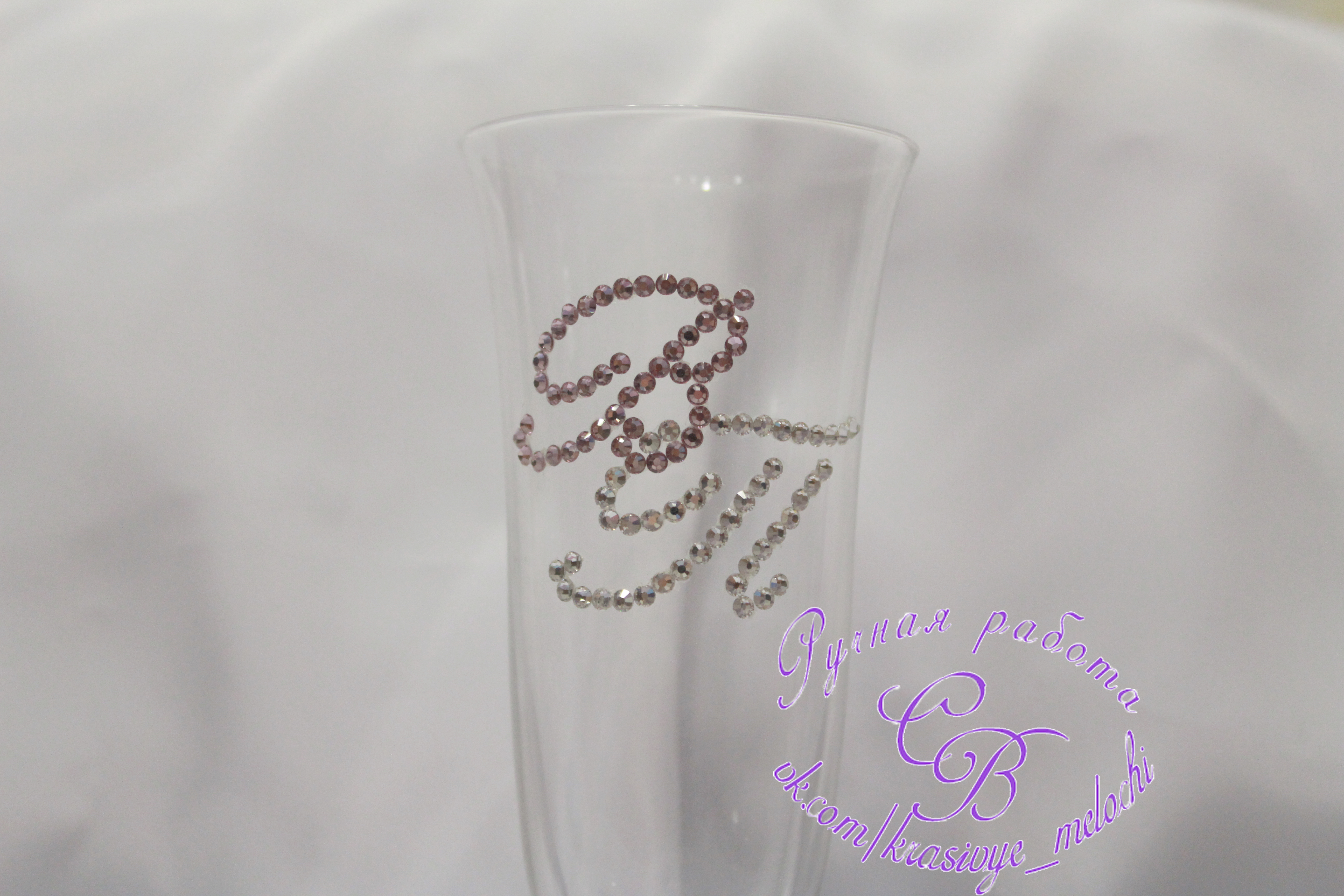 Изысканная форма бокалы, украшение из ленты и страз белого и сиреневого цвета)