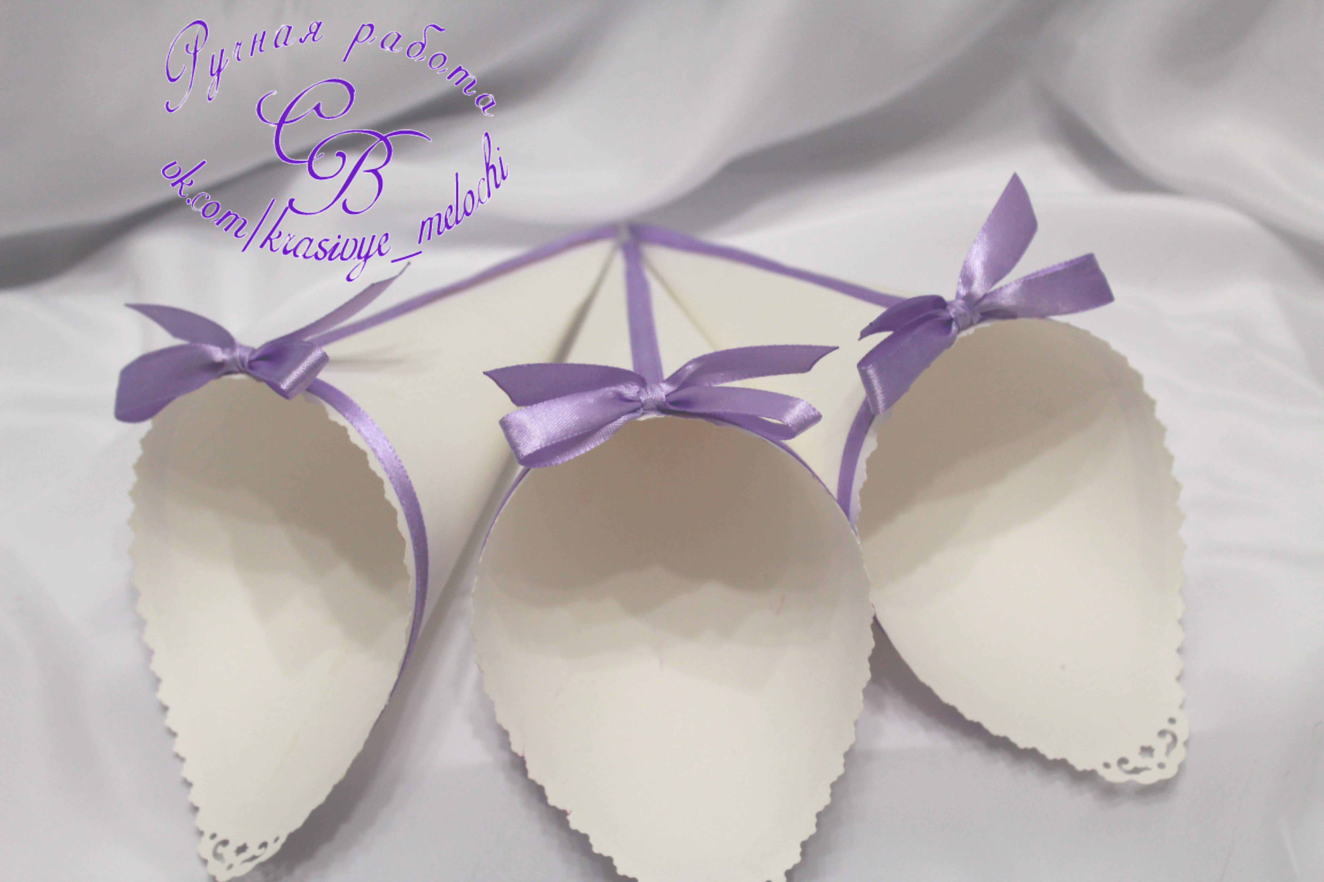 Кулечки для лепестков роз - белый картон, узорный край и уголок, декор из сиреневой атласной ленты)