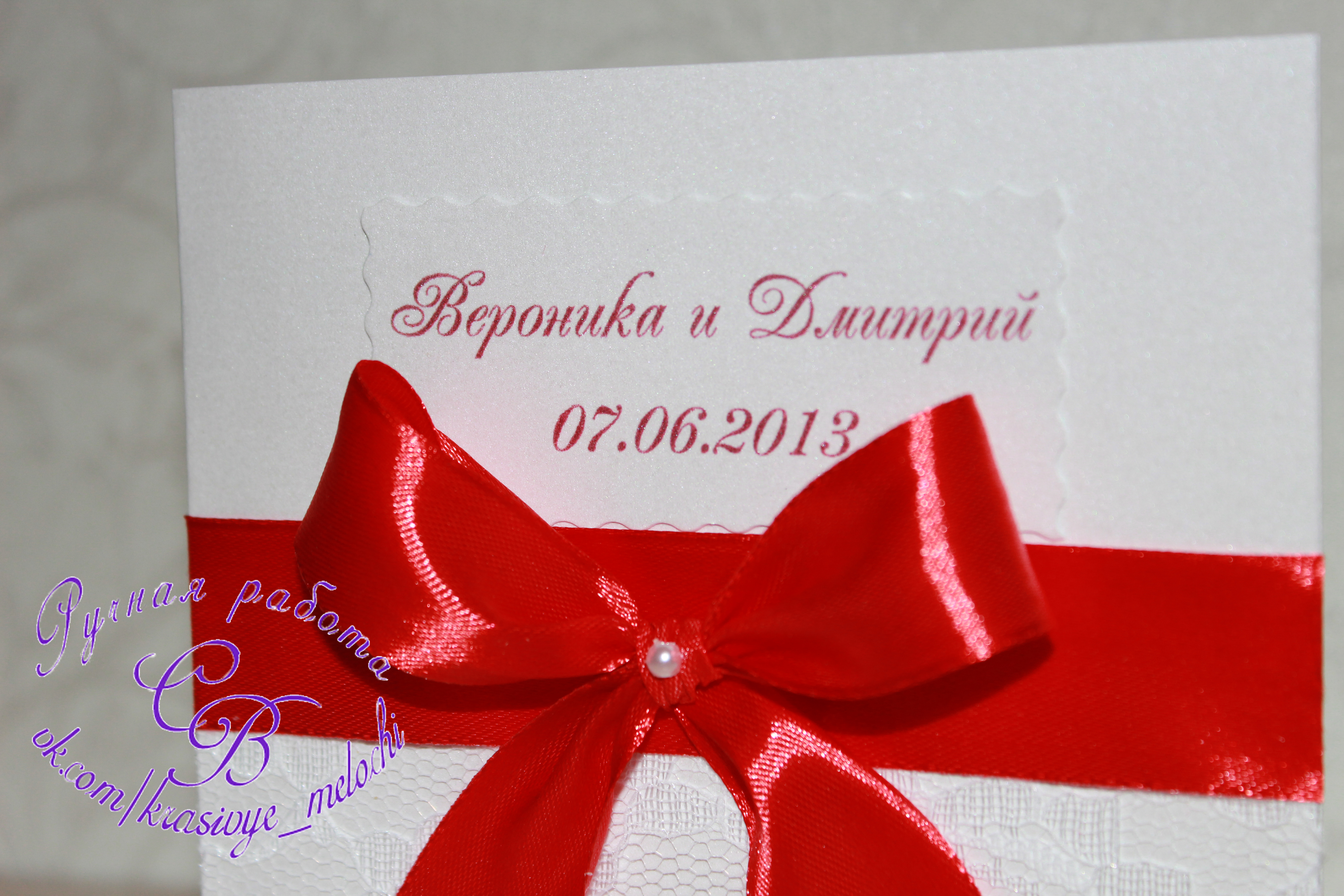 Белый перламутровый дизайнерский картон, тонкий гипюр, яркий красный бант и мелкие полужемчужинки для украшения